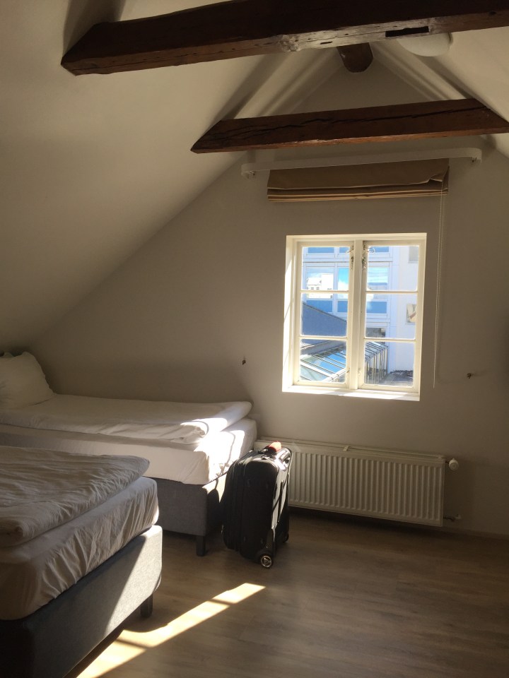 The room was a maze to find, but after four flights of stairs, five hallways and a couple of loops around this confusing hotel, I finally find our room and it is such a sight! We are on the top floor in an a-frame / attic-like room. Two wood beams pass through the ceiling, along with two twin beds and some mis-matched furniture. The bathroom is standard and I love our darling little window overlooking the street.