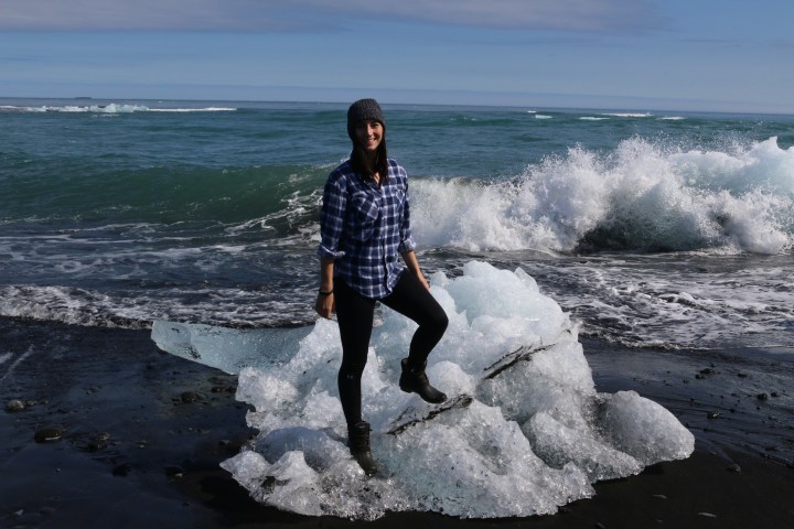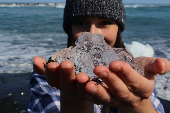 Across the street from Jökulsárlón is Diamond Beach, where all the broken iceberg pieces spill into the ocean. Now this was awesome as you could touch all the pieces that wash up onto the black beach; it looks like clear diamonds sparkling in the sun against the dark black sand.