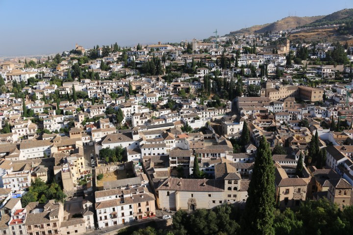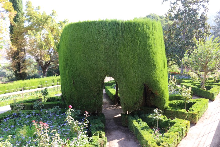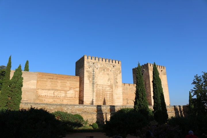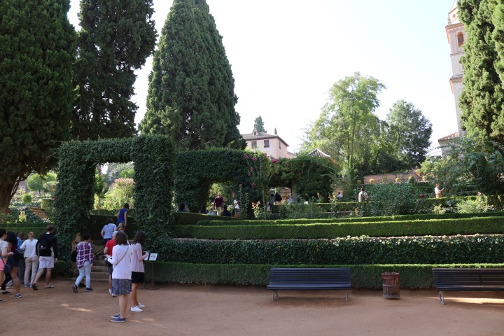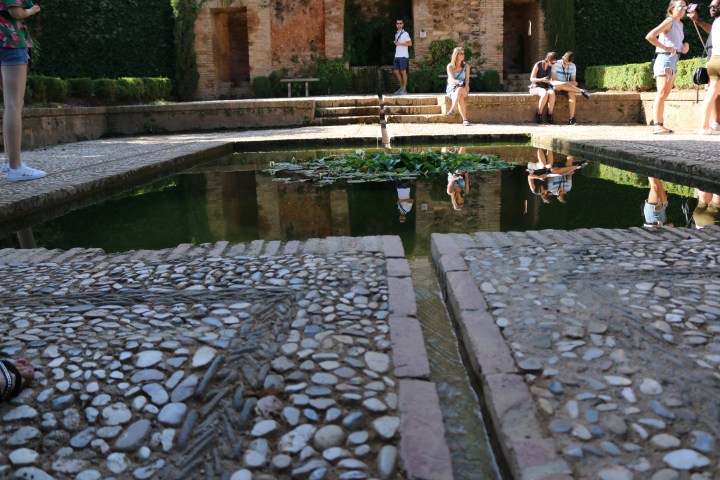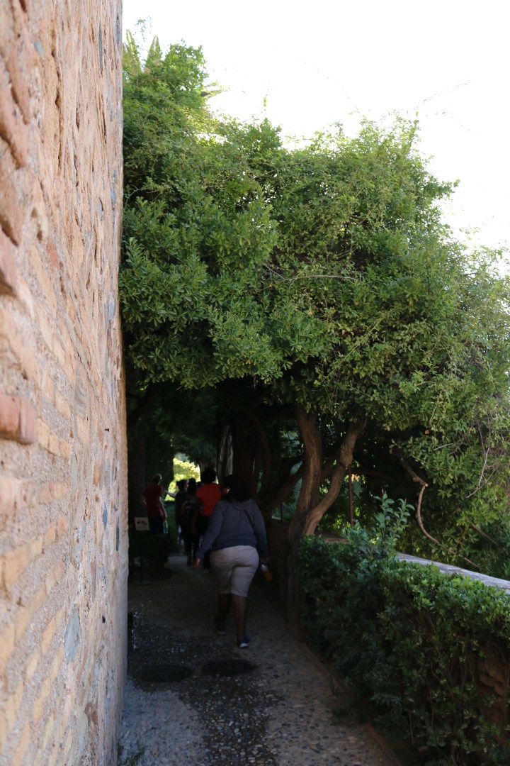 The morning is crisp with temperatures in the low 60s so we briskly walk to our first location – The Granada Cathedral. Our tour guide Ramon takes us around the perimeter of the cathedral then on and up winding cobblestone streets through La Plaza Nueva, and up to the Alhambra. This was a steep hike for some up through the gardens and pathways leading up to La Alhambra but it was such a beautiful walk in! Lush green pathways are showered with the morning sprinkler systems and it smells like the rainforest as we pass by trickling waterfalls, beautiful flowers and lush shrubs and trees.