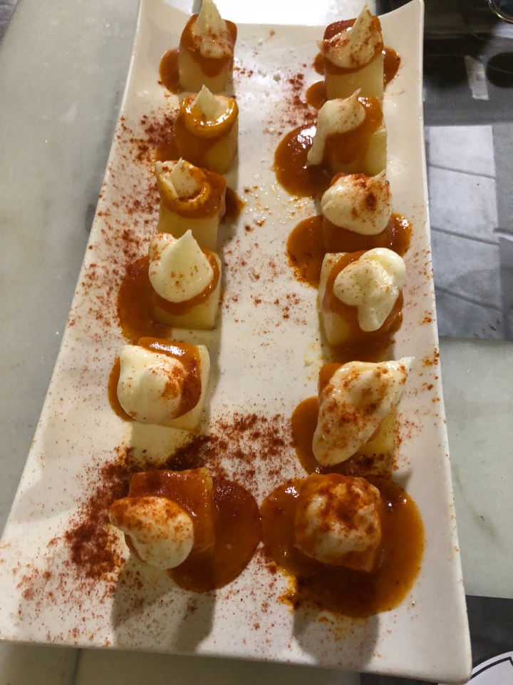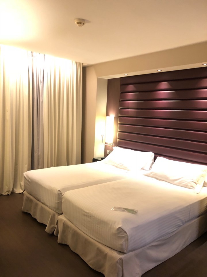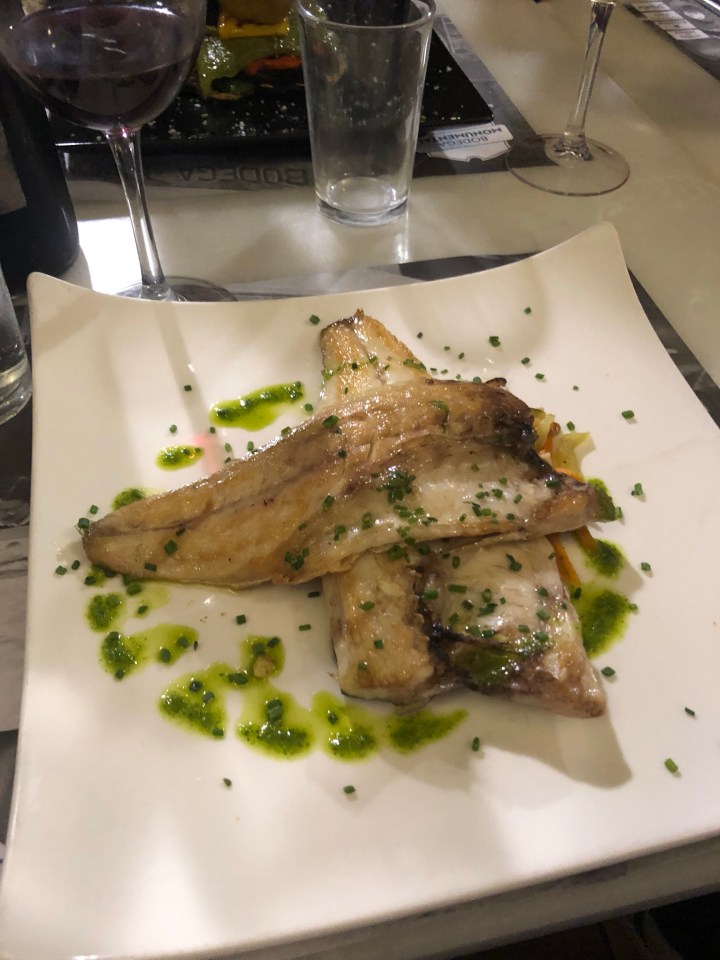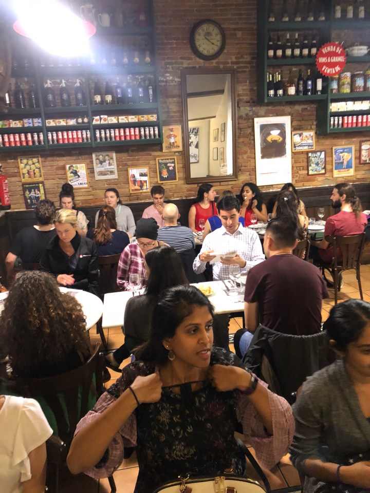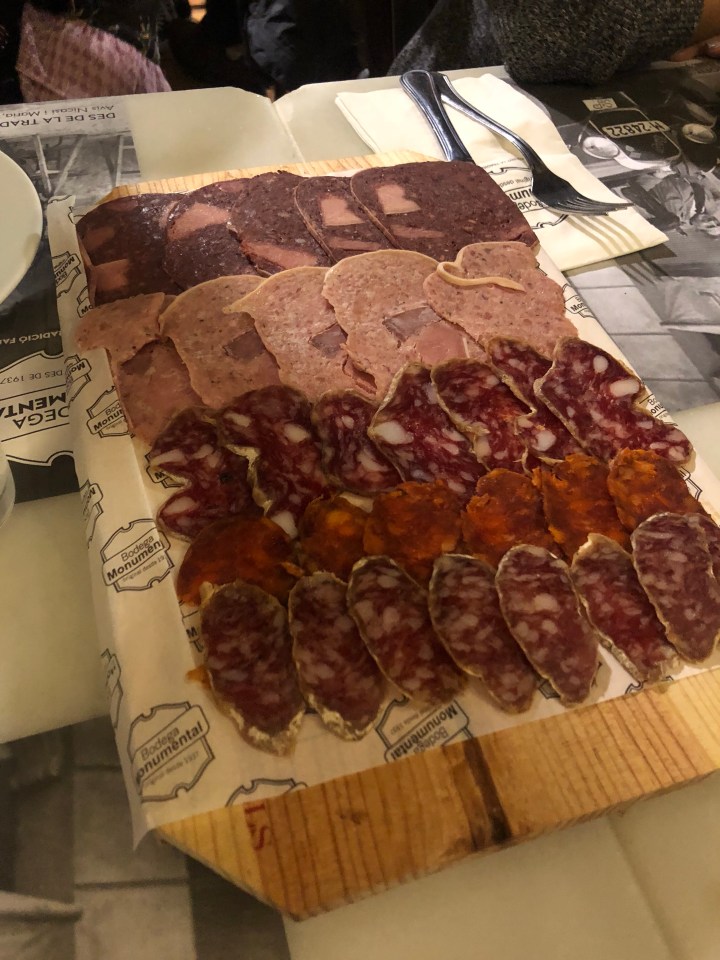 Upon arrival of Barcelona, a slight rain didn’t stop us from boarding the bus for a 10-minute ride to our Hotel Pestana Arena. Its a very modern hotel with darling floor to ceiling green lights illuminating our room numbers along with a cozy bedroom filled with amenities. We quick leave our belongings in the room before meeting the group back down in the lobby to walk 3-minutes over to dinner at Bodega Monumental Restaurante.