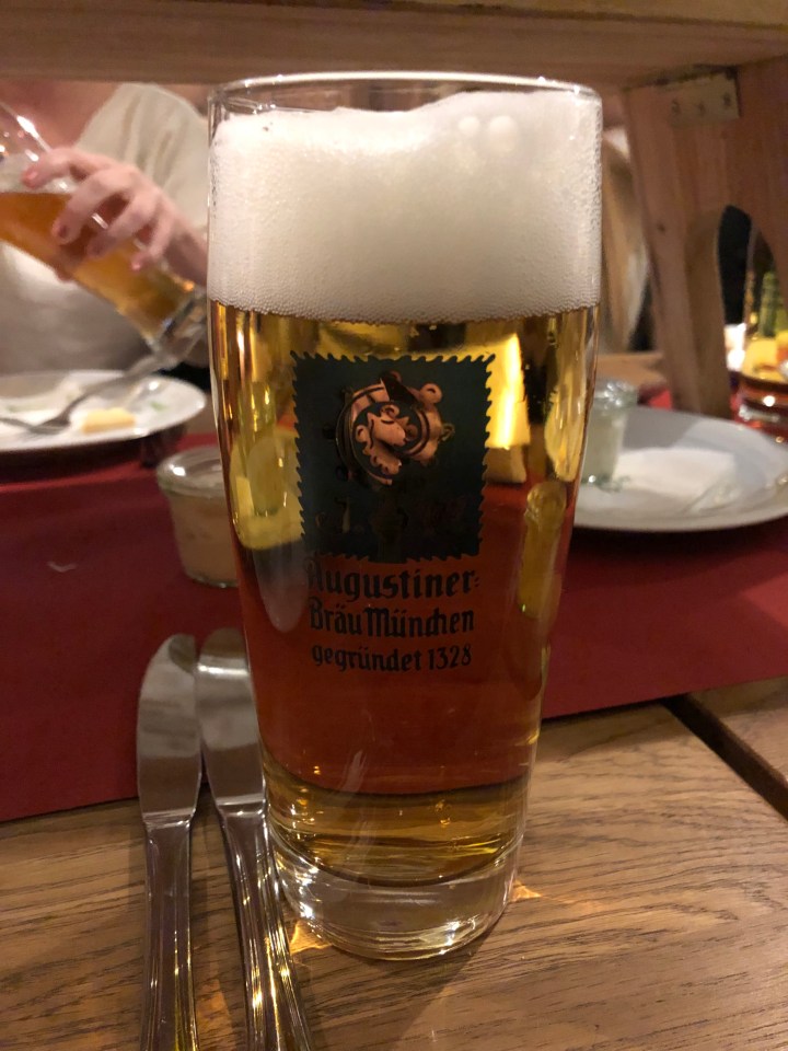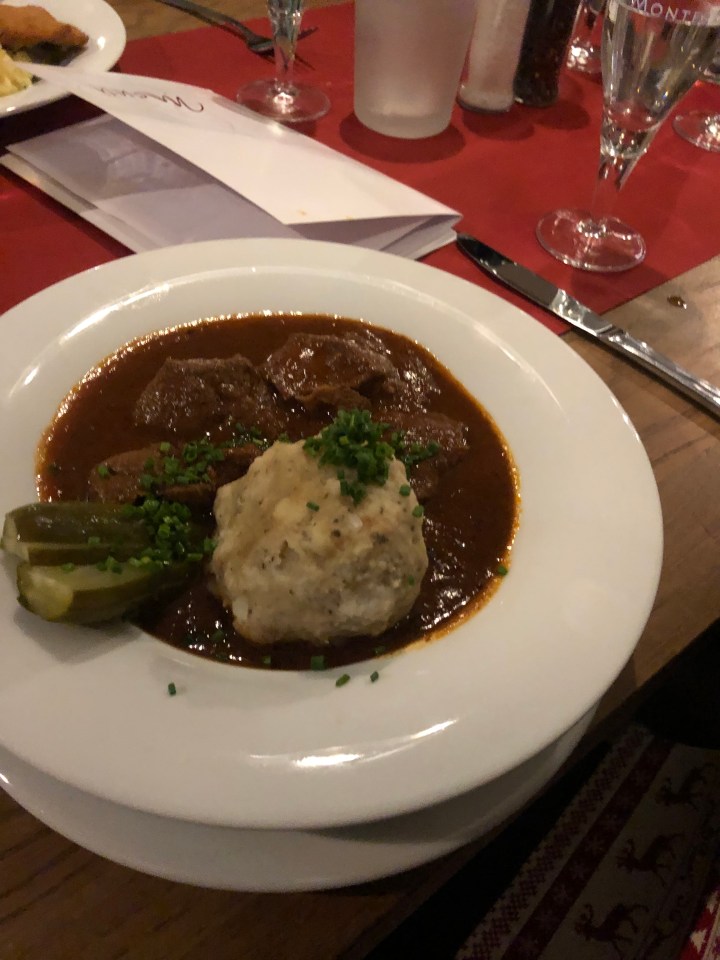 We meet the group downstairs at 6:30p for our group orientation and a glass of prosecco. After introductions, we walked 15 minutes to Bierstindl for dinner. We enjoyed Tyrolean dishes such as braugulasch (goulash), Hausgemachte Kasespaztle (a hearty mac & cheese) and my favorite and choice for dinner – Wiener Schnitzel vom Schwein. The meal was beyond fabulous, accompanied by the house lager, and we all laughed and chatted through dinner.