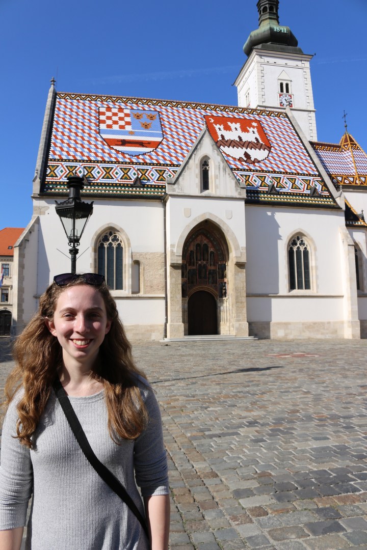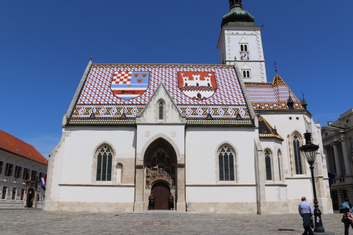 The Lotrščak Tower is a fortified tower located in Zagreb, Croatia, in an old part of town called Gradec or Gornji grad. The tower, which dates to the 13th century, was built to guard the southern gate of the Gradec town wall. We are unable to enter a lot of sites and shops as they are closed due to the Easter holiday. We the walk up the street to the magnificent St. Mark’s Church.