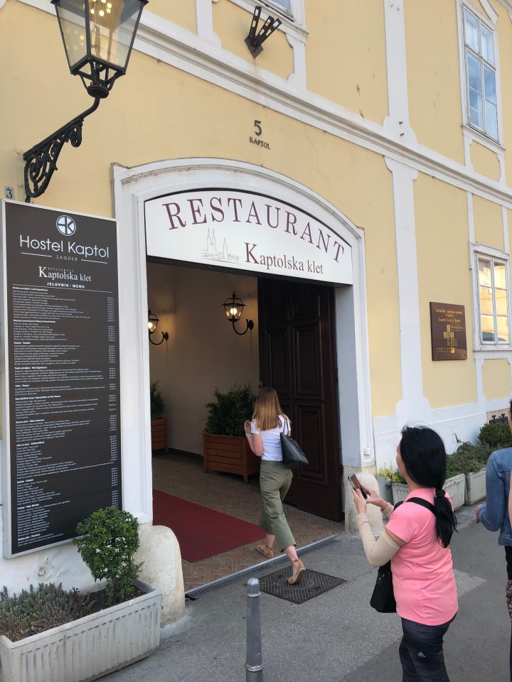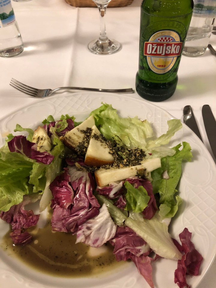 It’s a charming restaurant right across fromthe cathedral in which we enjoy a group dinner of wine/beer, leafy salads with pumpkin seed pesto and baked smoked cow milk cheese, samobor sausage, fries and chocolate mousse and banana dessert. It was fantastic and very filling.
