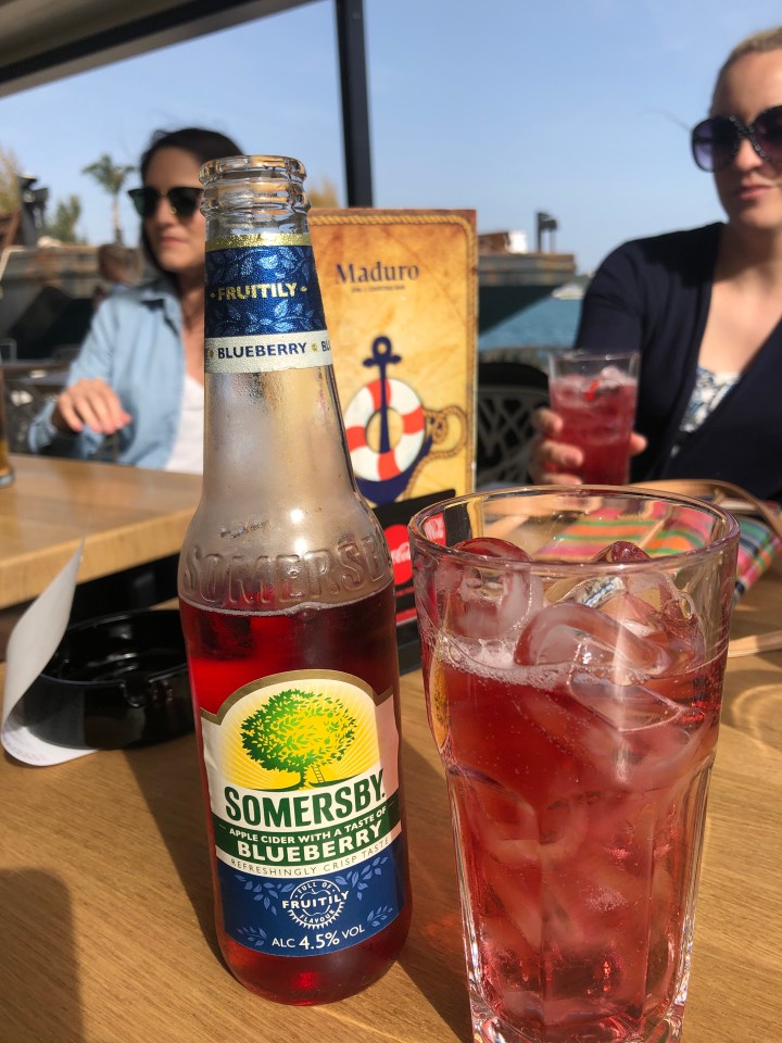 We make our first stop at Maduro Gin and Cocktail Bar for our first drink of the evening. We enjoy blueberry Somerby cider and some beer right off the pier. The weather has been slightly windy but in the high 60s with beautiful sunshine all day which made it a perfect day to stroll and relax alongside the waterfront.