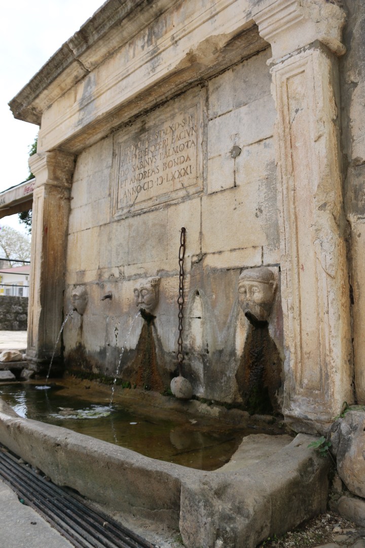 We enjoy colorful mixed drinks and creative finger crackers as we sip our refreshing cocktails next to a 70-meter long aqueduct, that leads to a fountain with a pond. Thousands of orange and yellow goldfish swim among tadpoles and bullfrogs. We take more more photos before we board the bus once again 20 minutes to our final destination – Dubrovnik.