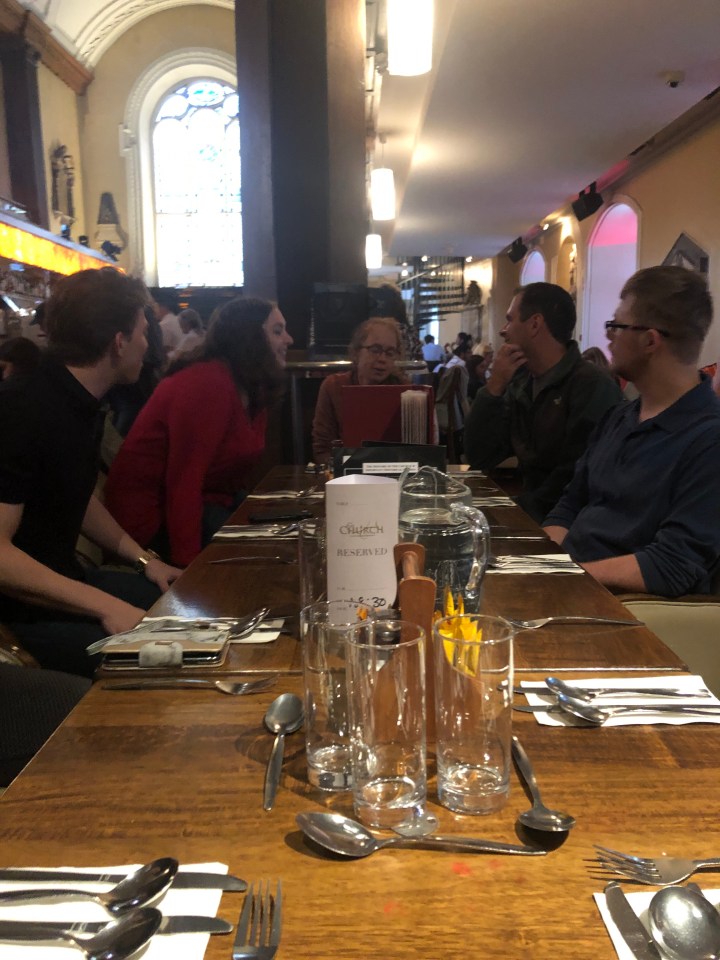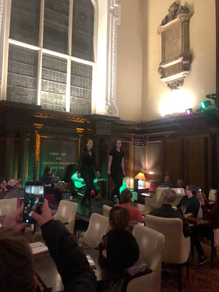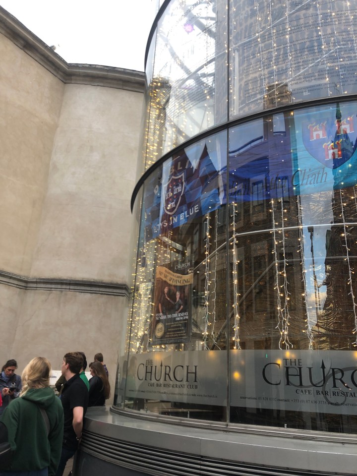 The group meets in the hotel at 6:15p and we walk 10-minutes down the street to The Church Cafe/Bar/Restaurant. This is a 350-year-old converted church with ground-floor seating and a long bar down the center. We enjoy a traditional irish live music and even included two women riverdancing on a stage to the lively music.