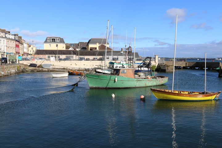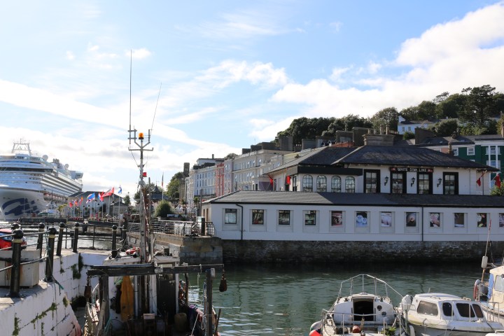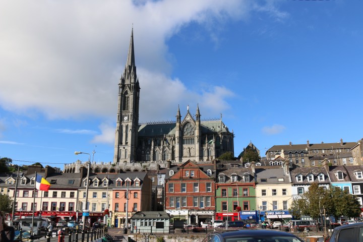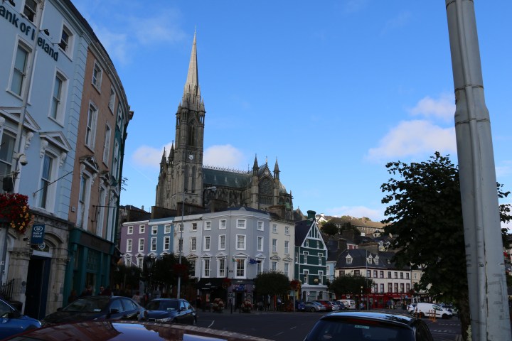 After, three of us stroll along the promenade, passing colorful buildings, souvenir shops, pubs, and multi-colored boats bobbing out in the water. We get a spectacular photo op of the Cobh Cathedral before having to walk back down to the bus.