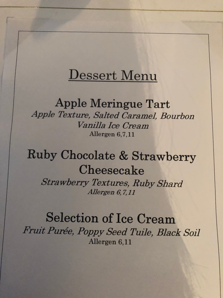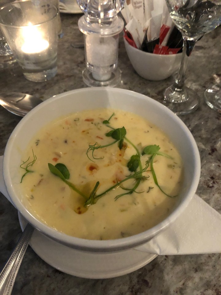 45-minutes back to our hotel and I have some time before we meet for dinner so I make a quick walk down the street to the pharmacy for some allergy medicine (the pollen count is extremely high here right now). Afterward, I meet the group in the lobby and walk over to The Pembroke Restaurant for dinner. We enjoy a luxury 3-course dinner of a choice of a starter, entree and dessert. I chose the chowder, fish and apple tart for dessert. All three were absolutely delightful!
