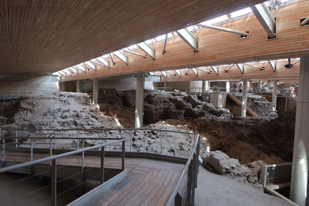 Today we visit the archaeological site of Akrotiri, a Minoan Bronze Age settlement that came to an abrupt end in approximately 1613 BC with a catastrophic volcanic eruption. Beginning in 1967, excavations of the Minoan town revealed buildings, drainage systems, and pottery, but no human remains or gold valuables, indicating locals had time to flee before disaster hit.
