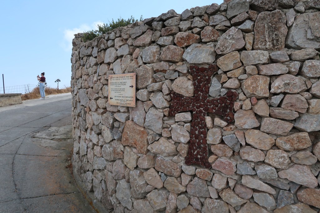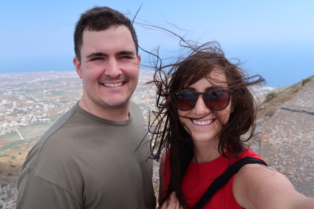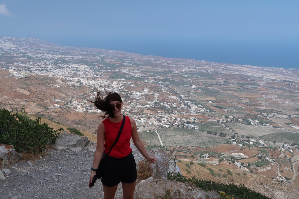 We enjoy a panoramic view of the island from above. After taking some scenic windblown hair photos, we load back on the bus and drive down to Venetsano Winery.