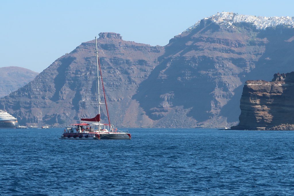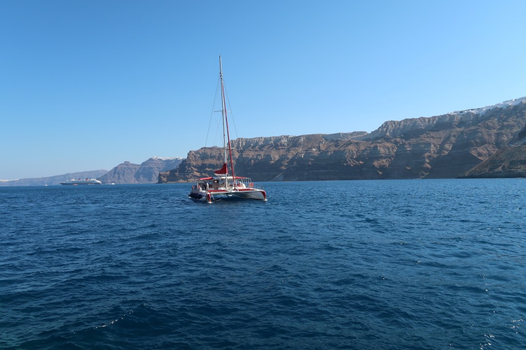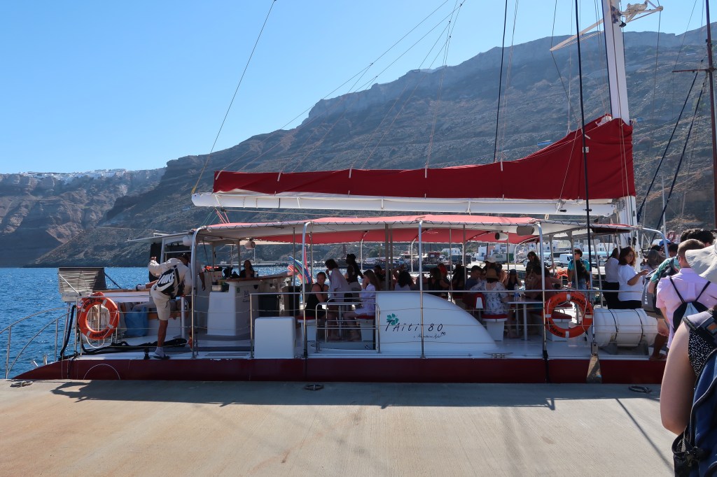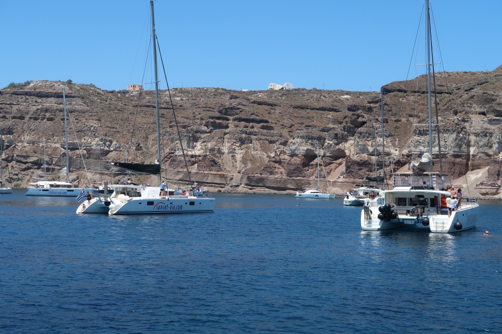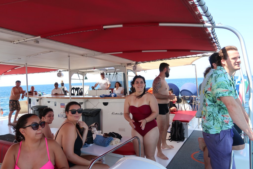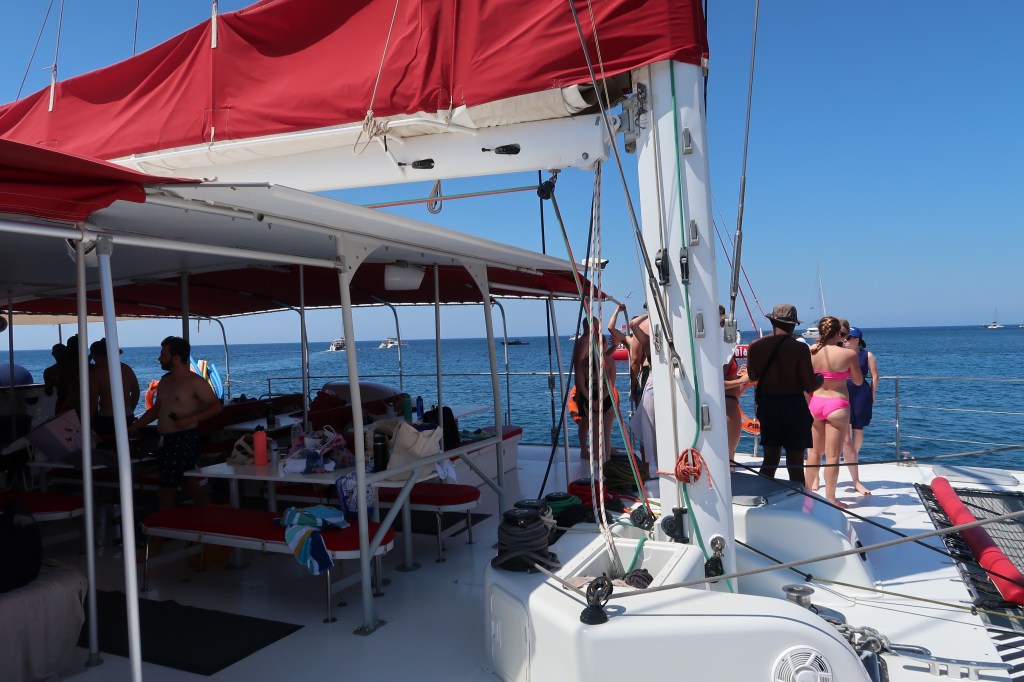 60 of us board the catamaran and we cruise out into the blue ocean. We pass small little private beaches with umbrellas and beach chairs. White and red catamarans anchor out in the little coves and we enjoy the gentle waves.