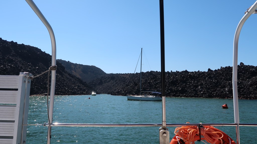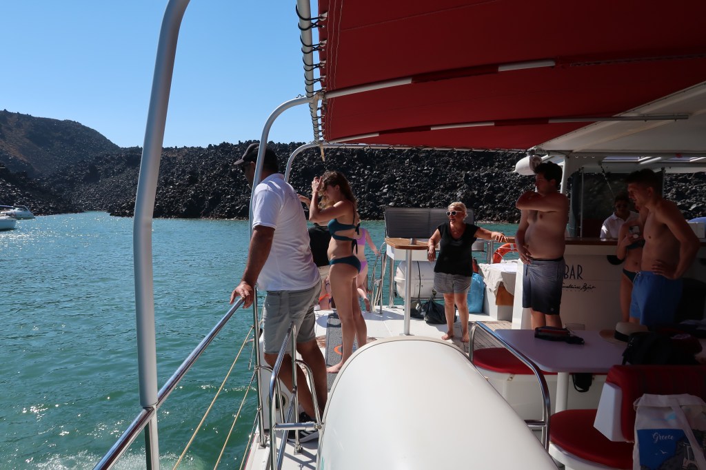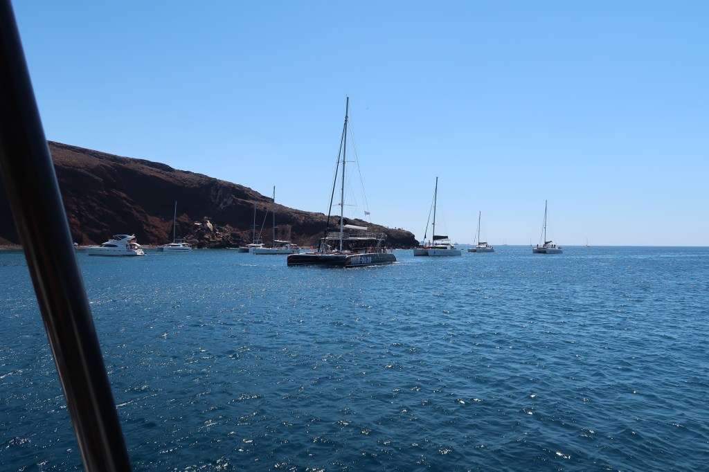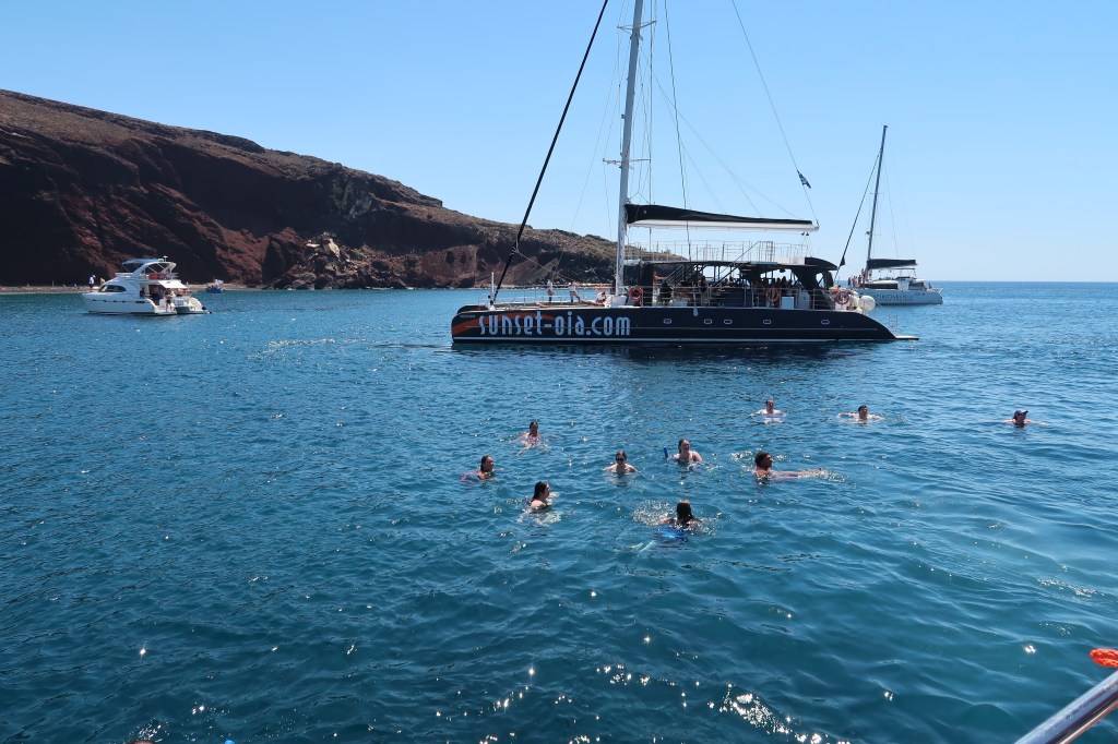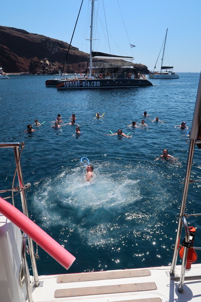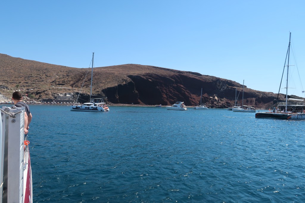 After a few minutes in the water, we are back on the boat and head to our second cove – the red beach. Again we can either dive into the water or sunbathe on the front of the boat. I opt for the front of the boat this time while Jay dives in again.