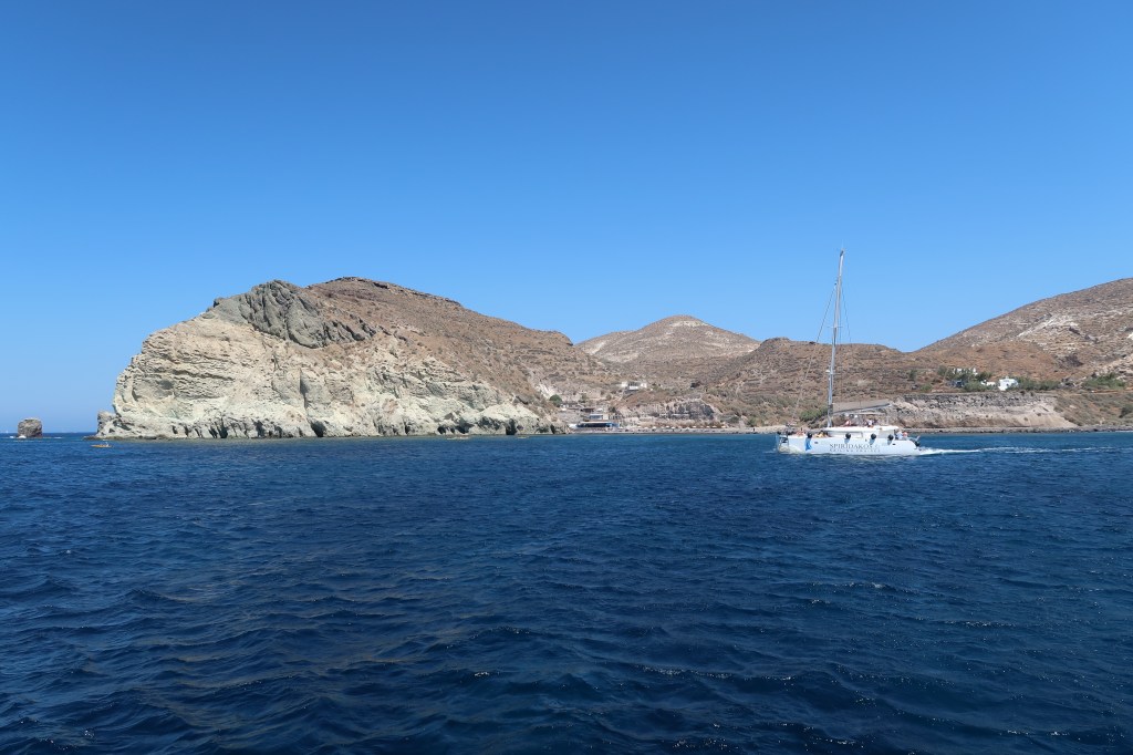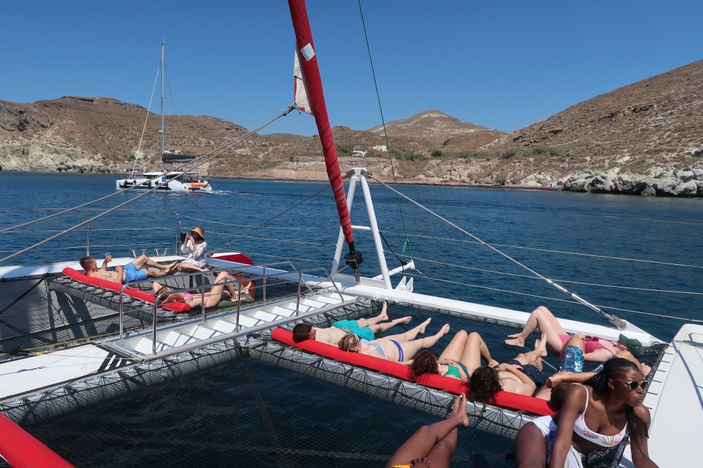 We are up at 6:30am to eat breakfast and be ready to board the bus at 8:50am. Its another beautiful, sunny 78 degree day, and we make our way down to the water to join the second AESU Greece tour group on a 5-hour catamaran.