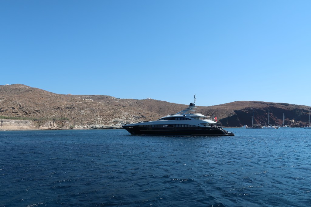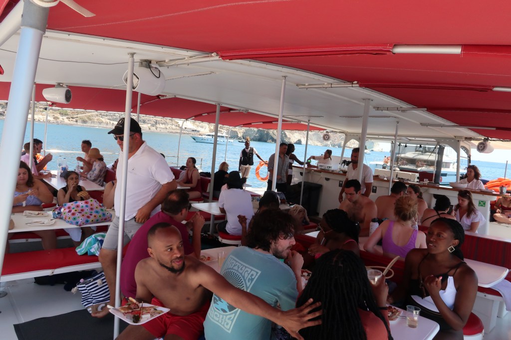 We pull up the anchor and sail to our last cove – the white beach. Here we can dive into the blue water one last time as the air is now filled with the smell of BBQ. The boat’s staff prepare a gorgeous lunch for us of greek salad, grape leaves, feta, tzatziki, and either chicken or pork slouflaki gyro. The meal was beyond delicious and the best lunch to enjoy with the incredible view.