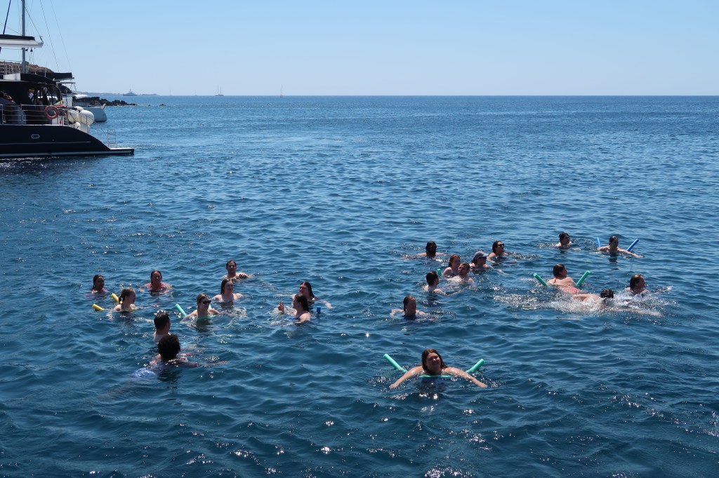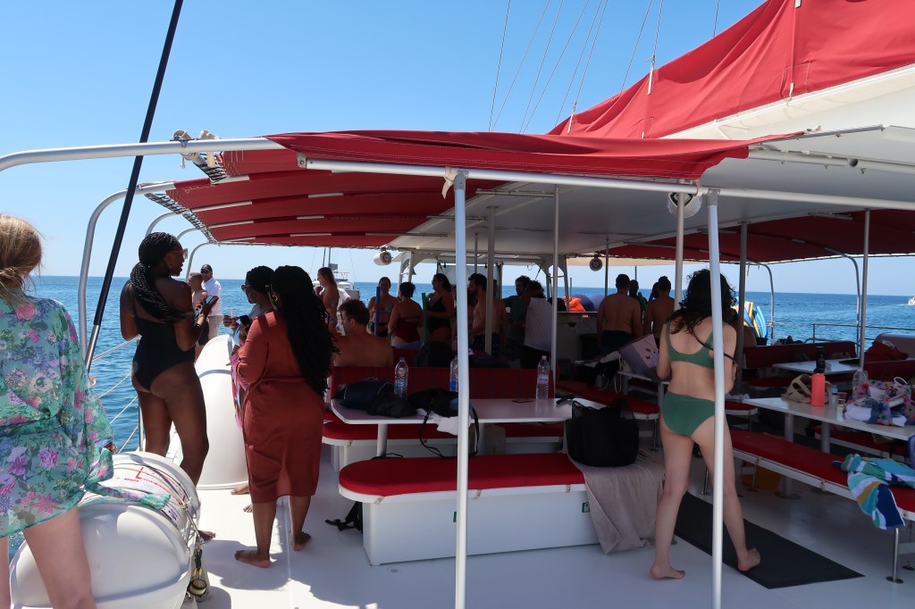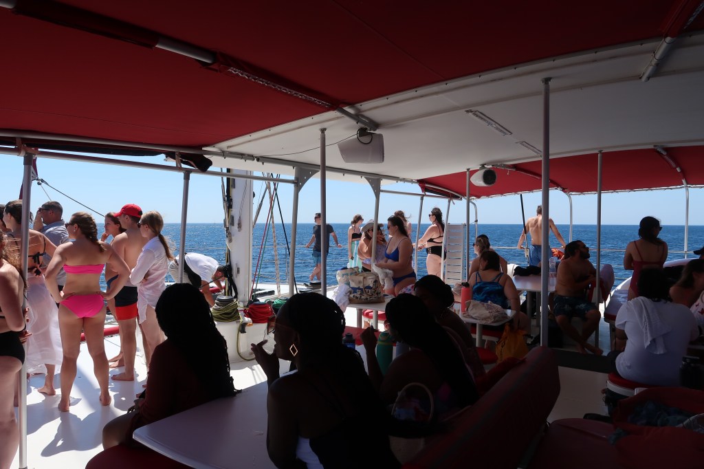 The group all sunbathes on the deck as we listen to a mix of 90s music, “Mamma Mia’ and other island music. If you look over the side of the boat, you can see clear down to the bottom of the crystal blue water.