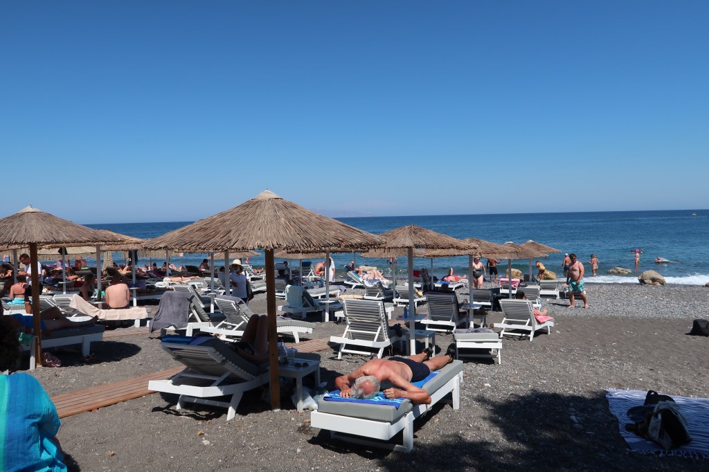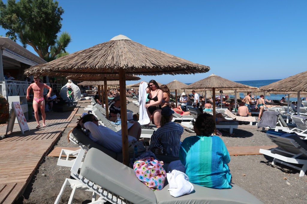 We arrive at a private beach club, Ariale, in which we are provided lush beach chairs, palm umbrellas, and service staff scuttling from chair to chair offering the option to order drinks and small menu items. The group lays out in the sun (or shade) for a much-needed beach day. The sand is black and rocky, with some of us venturing out to cool off in the waves, while others sit back and sip cocktails. Women are walking around offering food and back massages, and others instead of sitting on the beach, go into town for a bit of light shopping.