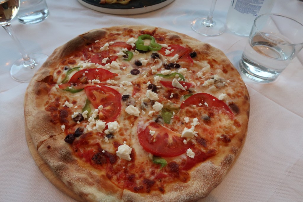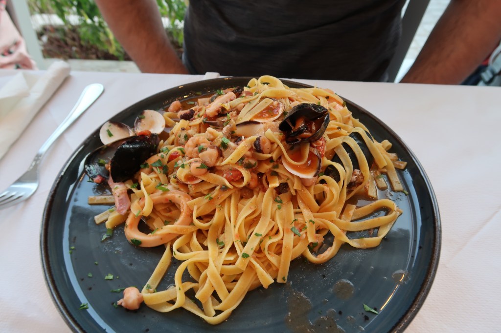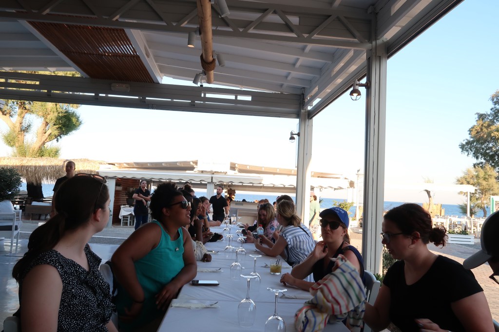When they return, the group walks across the street to the beach club’s restaurant, Ariale Restaurant, for a spectacular meal of white wine, seafood tagliatelle (seafood pasta), pizzas, and greek yogurt with honey for dessert. We were all drooling over the meal and were content and now sleepy as the sun begins to set. The moon tonight has a red glow to it, and as we wait for the bus to pick us up, we take a quiet stroll down the street.