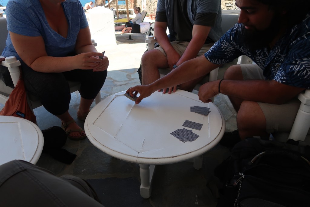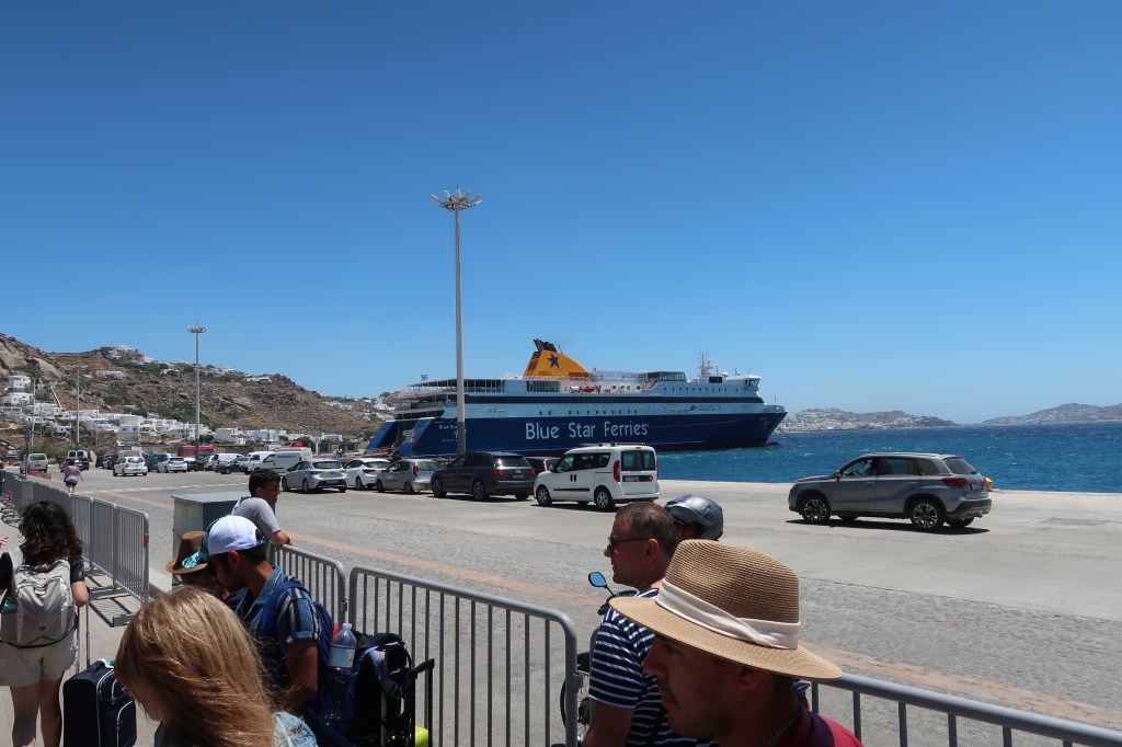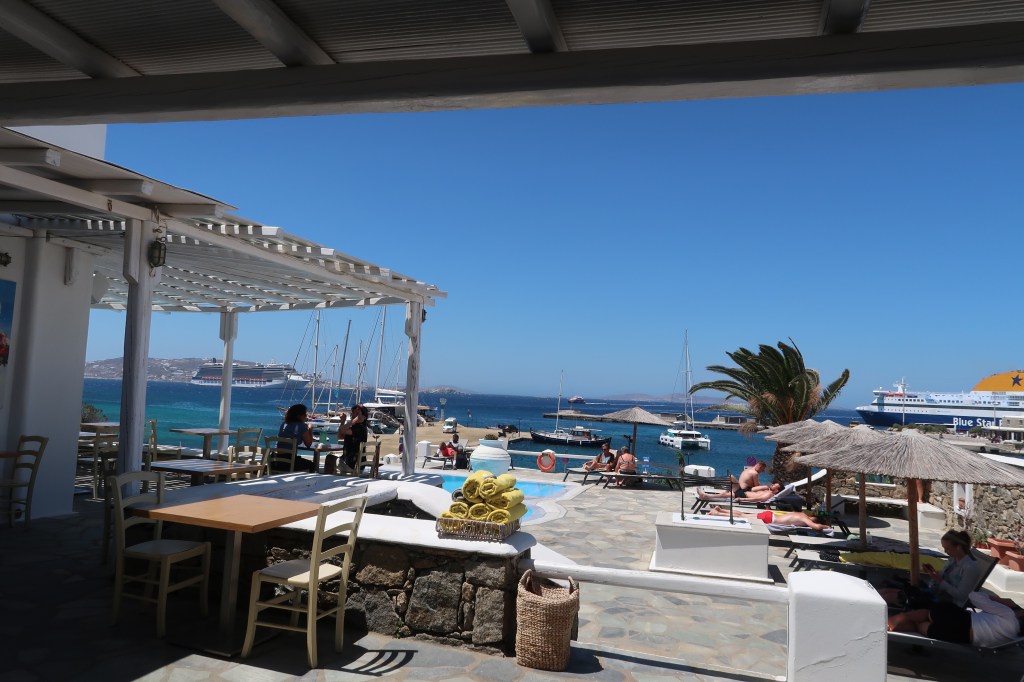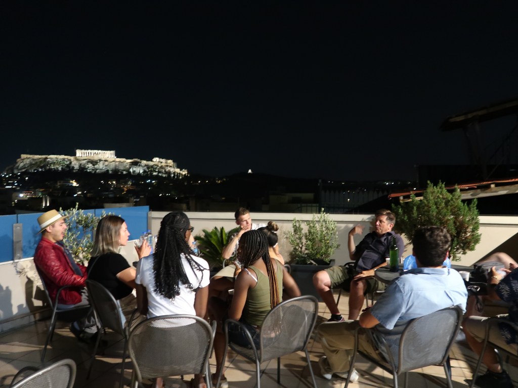 Today we enjoy a nice morning of sleeping in and breakfast again on the terrace. We leave all our luggage in the hotel lobby at 11:00am and wait out around the hotel pool area for two hours before we have to take a bus to the ferry that will take us to our next stop – Athens. Some sunbathe out by the pool, while others play card games, go for a local hike, or take a quick trip back to the Old Port of Mykonos.