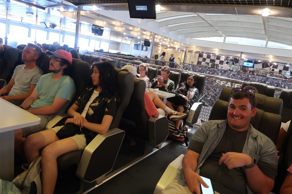 Our trip over to Athens is another SeaJet ferry, which is a quick one. Jay and I purchase some ice creams as we wait to load the boat. We are sitting on the top indoor deck of this ferry, with little tables between us, and we relax and enjoy the swift 3-hour ride to Athens.