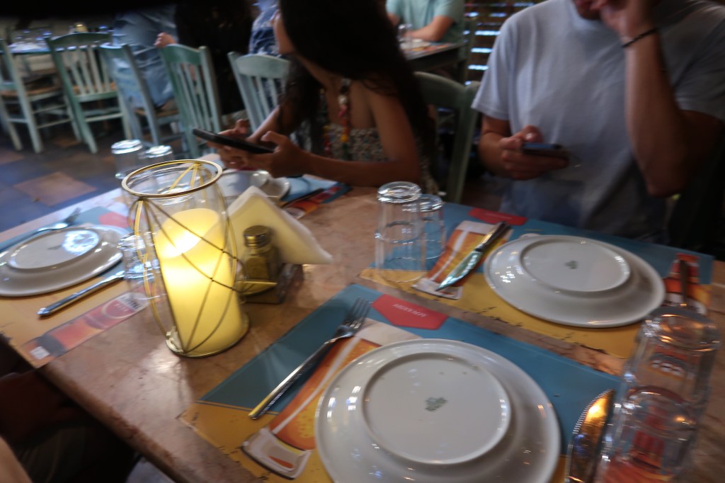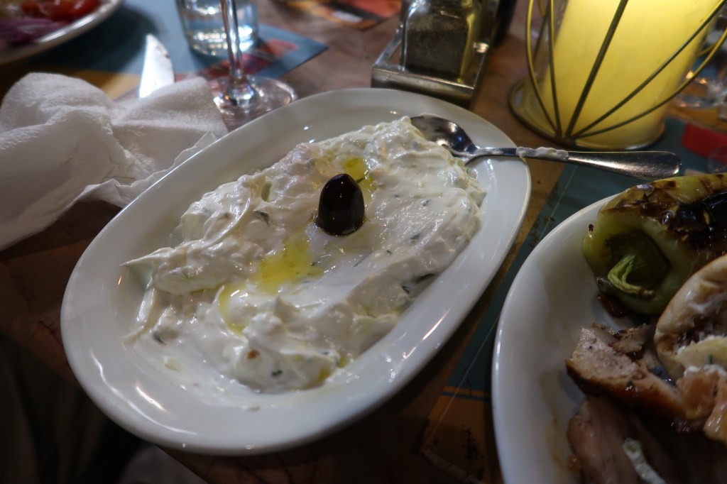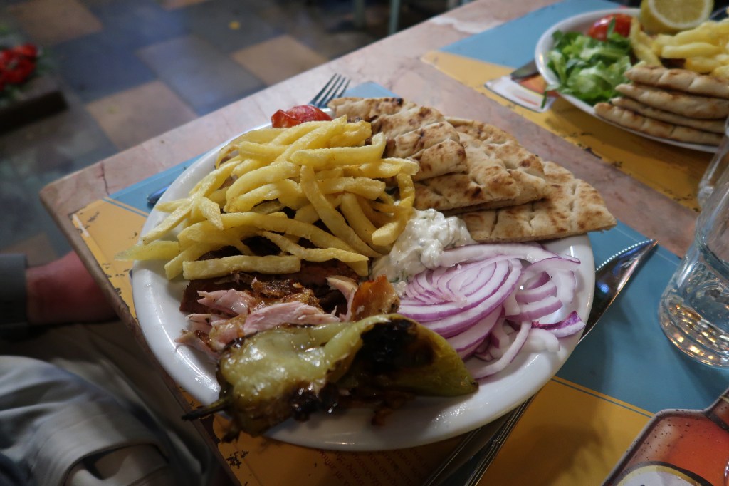 Dinner is just around the corner at Ayschilou. We are escorted into the indoor garden patio where we sit together in small tables and order a bottle of wine to share. Jay orders a pork, chicken and lamb gyro sample platter, I order the pork gyro platter, and some tzatziki to share. This meal was a perfect end to a long day and we all chit chat about our other travels and where we want to still go, as we sit under the trellis garden, with a small three-person string ensemble playing quiet greek music in the corner, and a bubbling fountain that is slowly being drowned out as more and more people enter the restaurant.