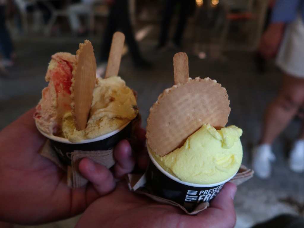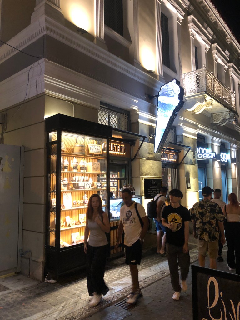 We round the corner and can see the Parthenon and ancient agora all lit up tonight, and we are excited to learn more about them tomorrow on our walking tour of Athens. We slip into a nearby ice cream shop for some dessert. Jay orders strawberry cheesecake and apple pie ice cream. I order the limoncello. We sit on a bench outside the ice cream shop and enjoy our nighttime treat, as we watch the people passing by. It is such a magical night to spend, listening to the chatter and people enjoying the festivities.